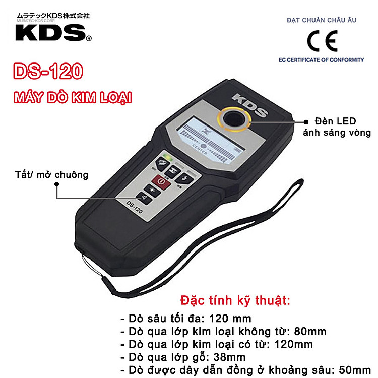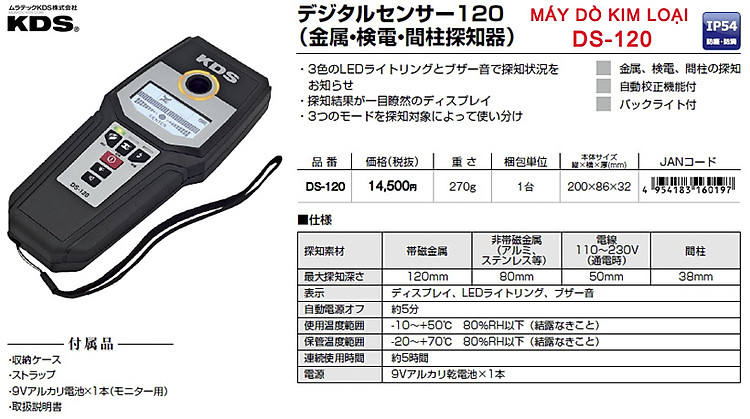 - Máy dò kim loại KDS DS-120 của KDS hội đủ các tiêu chuẩn đo đạc Nhật Bản và được sản xuất tại Malaysia. Máy chuyên dò các kim loại, dây điện, đinh tán, gỗ,… nằm sâu trong bức tường xi măng và gạch. Khi đã dò ra các vật sau bức tường thì đèn led sẽ báo hiệu cho bạn biết có vật lạ sau bức tường (có cả âm thanh báo). Máy dò DS-120 có 3 đèn báo hiệu chuyên nghiệp, báo dây điện, báo gỗ và báo kim loại.