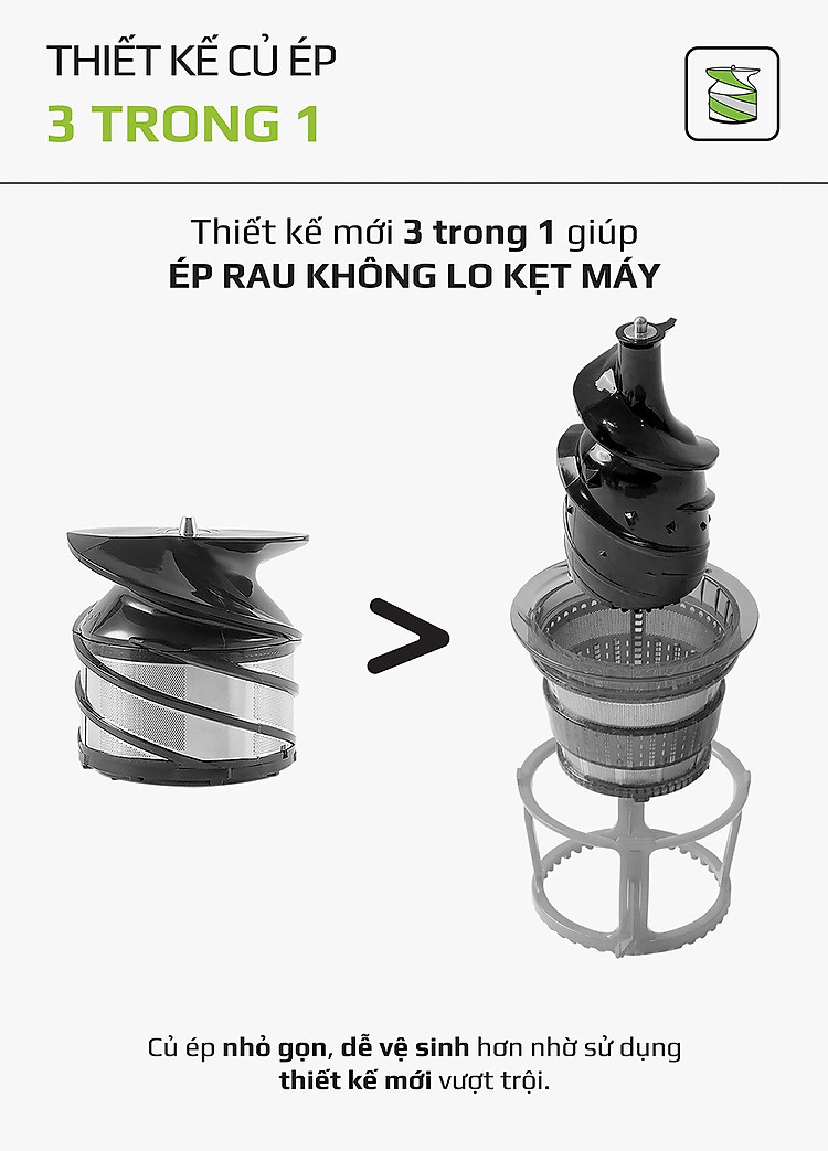 - Thiết kế củ ép mới giúp ÉP RAU KHÔNG LO KẸT MÁY
