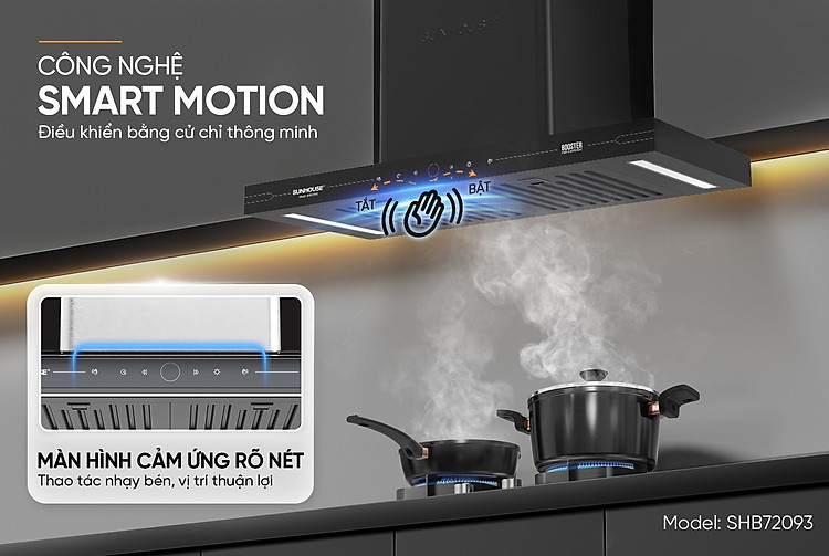 Máy hút mùi SUNHOUSE SHB72093 ứng dụng công nghệ cảm biến cử chỉ thông minh Smart Motion, mang đến trải nghiệm điều khiển hoàn toàn không chạm. Chỉ với thao tác cái vẫy tay, người dùng có thể dễ dàng bật/tắt máy hoặc điều chỉnh tốc độ hút theo nhu cầu. Tính năng này không chỉ đảm bảo bề mặt máy luôn sạch sẽ, giảm thiểu tiếp xúc trực tiếp để hạn chế vi khuẩn, mà còn tiện lợi khi bận rộn nấu nướng.
