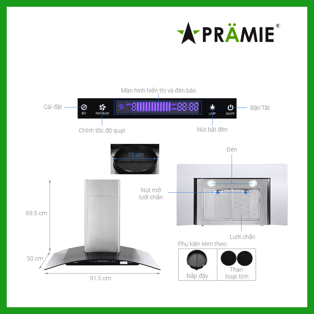 Máy hút mùi Pramie AC17-900 công suất hút lên đến 1100 m3/h, cho phép khởi động chỉ bằng một cái vẫy tay cùng bảng điều khiển cảm ứng linh hoạt và chức năng hẹn giờ tắt lên đến 30 phút hỗ trợ người dùng tối đa, hút mùi nhanh chóng trả lại không gian thoáng mát cho căn bếp được nhiều người tin dùng