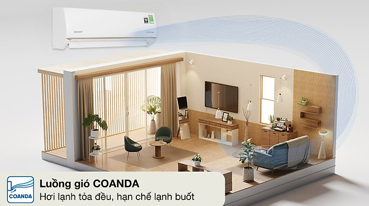 - Máy lạnh Sharp được trang bị luồng gió thoải mái Coanda – khí lạnh hướng trần nhà giúp làm mát đồng đều, không gây cảm giác buốt.