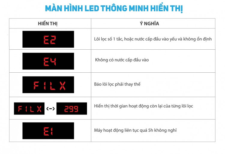 - Tính năng tự động báo hiệu nước đầu vào yếu hay mất nước giúp tăng tuổi thọ và độ bền của hệ thống linh kiện và màng lọc