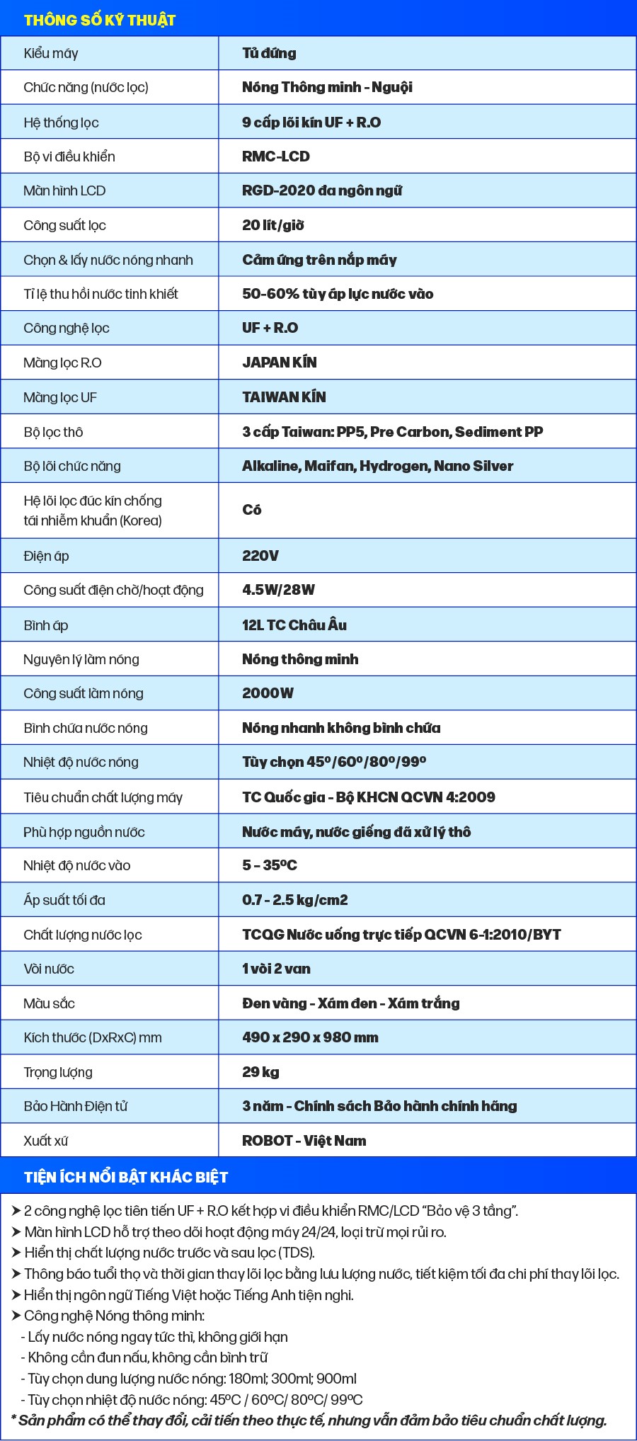 - Máy lọc nước Nóng Thông Minh – Nguội ROBOT CLASSY PRO 339GHKQ-UR thuộc dòng Máy lọc nước thế hệ mới của ROBOT, duy nhất trên thị trường sử dụng công nghệ “Bảo vệ 3 tầng” gồm 2 màng lọc UF + R.O & vi điều khiển RMC/LCD, hỗ trợ người dùng trực tiếp kiểm soát chất lượng nước trước & sau lọc, cảnh báo rủi ro trong quá trình sử dụng.