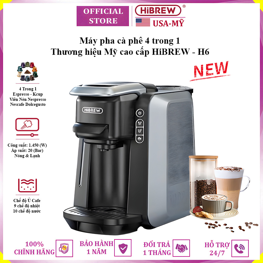 Máy pha cà phê 4 trong 1, Espresso, Viên Nén Nespresso, Nescafe Dolcegusto, Kcup thương hiệu Mỹ cao cấp HiBREW H6
