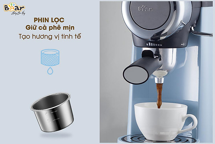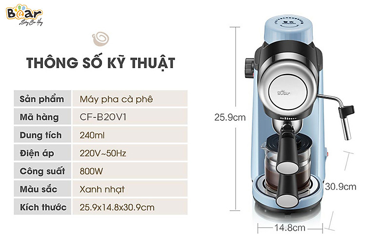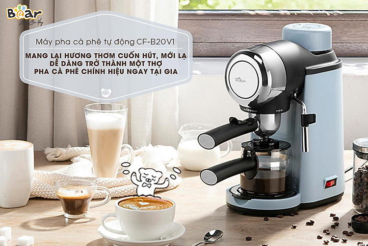 Với kiểu dáng và thiết nhỏ gọn, máy không tốn nhiều diện tích mà còn trang trí cho không gian thêm phần cuốn hút hơn. Máy pha cà phê espresso Bear CF-B20V1 (KFJ-A02N1) là dòng máy pha cà phê bán tự động, chiết xuất ra cà phê espresso nguyên chất chuẩn hương vị Ý chỉ mất 15 giây. Từ đó có thể sáng tạo ra các vị cà phê khác nhau như: latte, cappuchino, mocha,