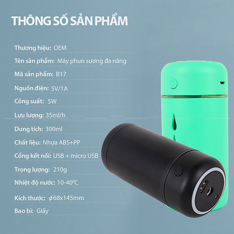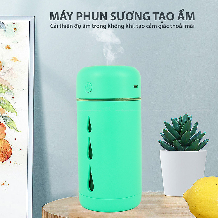Máy phun sương đa năng B17 màu lá có khả năng cải thiện độ ẩm trong không khí giúp hạn chế các dấu hiệu thiếu độ ẩm như da khô, hắt hơi hay đau họng, đồng thời thiết kế cổng sạc USB giúp tiện lợi khi di chuyển, dễ dàng mang đi du lịch.
