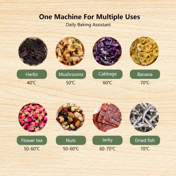 - Có chức năng điều chỉnh hẹn giờ và nhiệt độ; Nhiệt độ sấy có thể được đặt từ 35 ℃ -70 ℃, trong khi thời gian có thể được đặt từ 0-24 giờ; Chọn thời gian và nhiệt độ tối ưu tùy thuộc vào thành phần; Quạt gió nóng sẽ tự động tắt mở để cân bằng nhiệt độ;