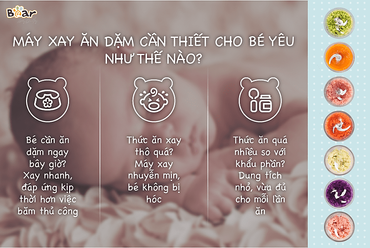 Ở những giai đoạn đầu của bé, việc ăn dặm rất quan trọng. Một ngày bé cần ăn nhiều cữ khác nhau và mỗi lần ăn khá ít nên việc sử dụng những máy xay cỡ lớn như hay khá lãng phí và không tiện lợi.