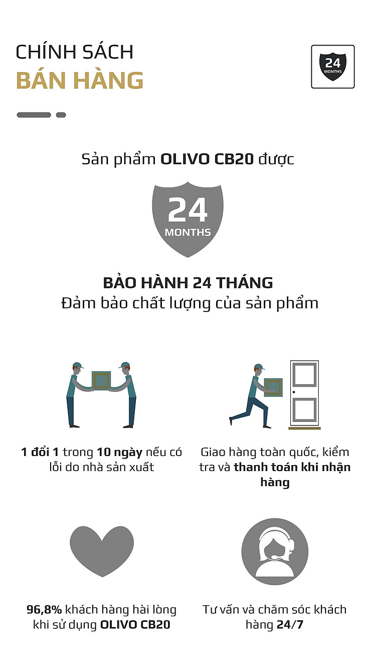 - Cuộc sống hiện đại, hối hả con người luôn ưu tiên những sản phẩm thông minh và đã được lập trình sẵn thông minh. Bảng điều khiển của OLIVO CB20 tích hợp 12 chức năng cài sẵn được chú thích rõ ràng bằng tiếng việt nên không chỉ bạn mà cả người già hay các bé trong nhà đều có thể dễ dàng sử dụng ngay từ lần đầu tiên.