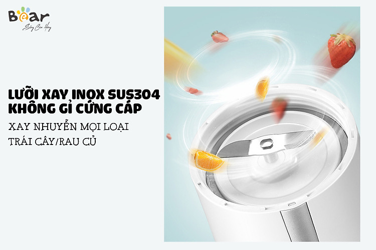 Máy xay sinh tố cầm tay Bear tích hợp lưỡi dao xay được làm từ thép không gỉ, sắc bén cùng cốc xay được làm bằng nhựa trong suốt, không chứa PBA, giúp bạn có thể an tâm thưởng thức các món sinh tố ngon miệng và tốt cho sức khỏe. Máy được trang bị pin Lithium tích điện thông minh, dung lượng pin lớn, giúp máy xay vận hành êm ái và bền bỉ hơn. Sau 2 tiếng cho 1 lần sạc máy, bạn đã có thể thưởng thức 10 ly sinh tố khác nhau, do đó, sau 2-3 ngày, bạn có thể sạc pin cho máy 1 lần. Đặc biệt, pin máy phù hợp với nhiều nguồn sạc khác nhau, từ củ sạc nguồn AC, sạc dự phòng, cho đến sạc máy tính hay sạc ô tô, Tất cả đều tương thích với máy xay sinh tố cầm tay Bear.