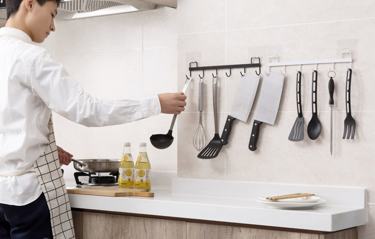 Phần móc treo làm từ nhựa chịu lực tốt, bạn có thể treo nhiều đồ trong nhà bếp như kéo, thìa,