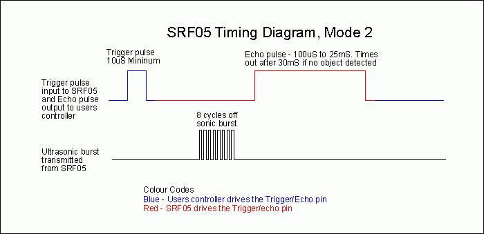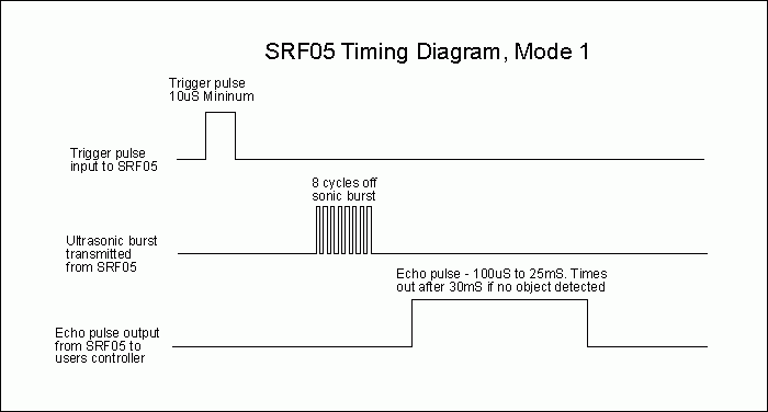 Để kích hoạt cảm biến SRF05 phát ra sóng siêu âm, cần tạo 1 xung có độ rộng mức 1 tối thiểu là 10us trên chân Trigger. Sau đó cảm biến siêu âm SRF05 sẽ tạo ra 8 xung để phát ra sóng siêu âm. Sau khi sóng siêu âm được phát ra, chân Echo ngay lập tức được kéo lên mức cao. Nếu sóng siêu âm gặp vật cản và phản hồi ngược lại cảm biến siêu âm, chân Echo sẽ được đưa xuống mức 0. Nếu độ rộng xung đo được lớn hơn 30ms, nghĩa là không có vật cản, hoặc vật cản nằm ngoài khoảng cho phép của module.