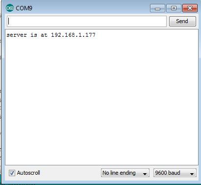 Bước 4: Click Serial Monitor ,một hộp thoại hiện lên để ta biết được địa chỉ IP (Đây sẽ là địa chỉ mà ta sẽ sử dụng để thông qua 1 trình duyệt web để đọc trạng thái các cổng của KIT Arduino Uno sẽ được hiển thị trên trình duyệt đó)