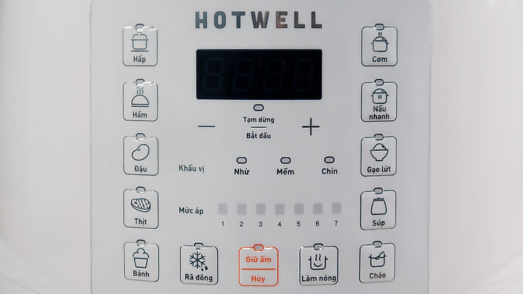 Nồi áp suất điện tử Hotwell mã PE50H1 được thiết kế bảng điều khiển tiếng Việt dễ hiểu cùng với màn hình đèn LED thiết kế trực quan hiển thị thời gian nồi đang nấu, thời gian nấu còn lại hoặc thời gian hẹn giờ chuẩn bị nấu. Bảng chỉ dẫn với 12 chương trình nấu ăn phong phú như hấp, hầm, đậu, thịt, bánh, cơm, nấu nhanh, gạo lứt, súp, cháo, làm nóng và rã đông thực phẩm, rõ ràng cho người ngay cả lần đầu sử dụng. Tùy chỉnh khẩu vị và mức áp suất linh hoạt được cho từng món ăn rất tiện lợi.