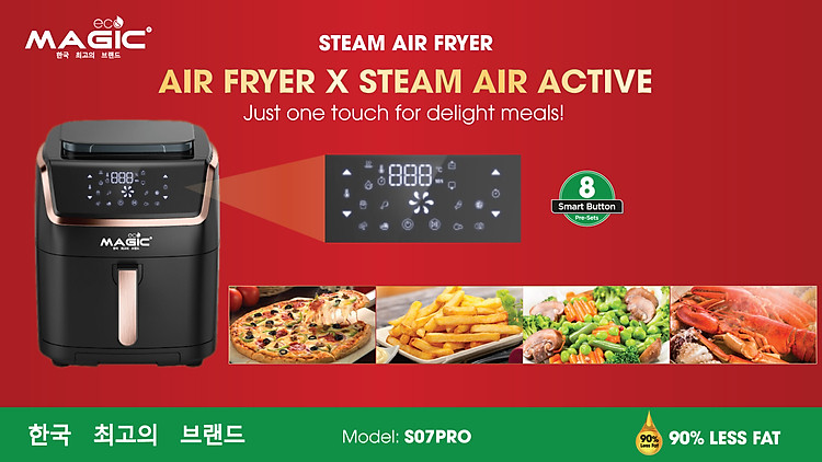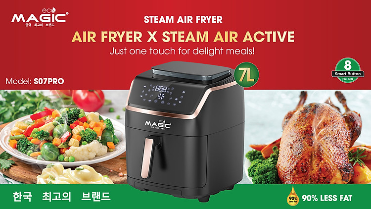 Nồi chiên không dầu kết hợp hấp cao cấp Magic Eco S07 Pro là sự kết hợp hoàn hảo giúp đột phá công nghệ nấu năng trong cùng một sản phẩm khi kết hợp giữa Chiên không dầu Rapid Air và hấp siêu nhiệt Steam Air Active.
