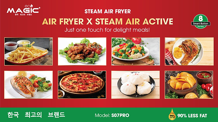 Nồi chiên không dầu kết hợp hấp cao cấp Magic Eco S07 PRO là bước ngoặc lớn trong công cuộc nấu ăn của nhiều chị em nội trợ. Đột phá thiết kế khi kết hợp cả hai công nghệ Chiên – Hấp trong cùng một sản phẩm. Công nghệ Rapid Air giúp giảm 90% lượng dầu mỡ, Công nghệ hấp Steam Air Active giúp cho các món hấp chín đều, căng mọng nước, giữ được trọn vẹn dưỡng chất bên trong thực phẩm cho hương vị đậm đà hơn. Chỉ với 1 chạm đơn giản bạn đã có ngay một bàn đồ ăn thơm ngon để chiêu đãi cả nhà, sử dụng đơn giản và tiết kiệm thời gian tối ưu.