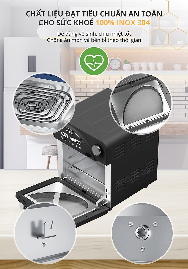 Đây là mục tiêu cũng như kim chỉ nam của dòng sản phẩm nồi chiên không dầu của SNAPBEE : với 100% chi tiết tiếp xúc với thực phẩm làm từ INOX chất lượng cao cấp, chịu nhiệt độ cao, không ăn mòn , không bị ám mùi, dễ vệ sinh, đảm bảo an toàn cho người sử dụng 1 cách tuyệt đối, an toàn cho thực phẩm.