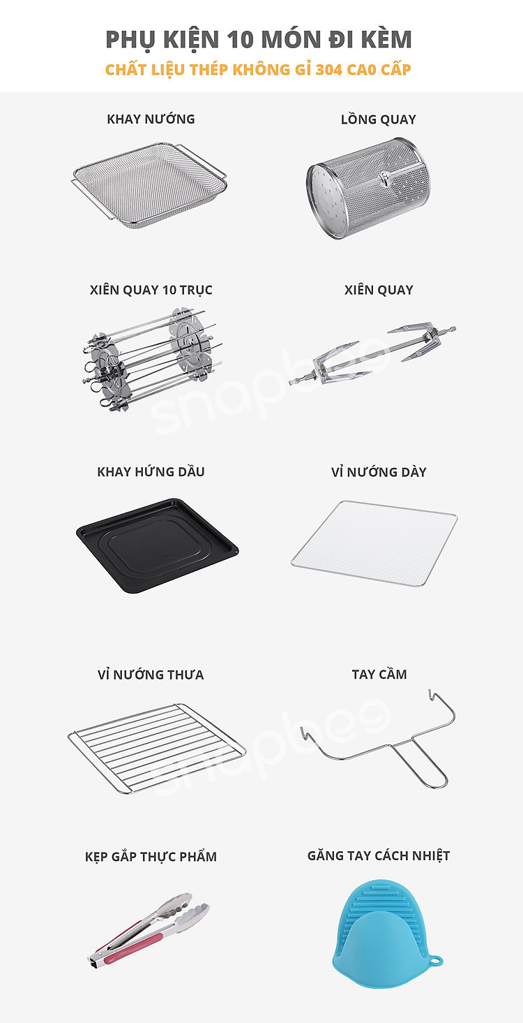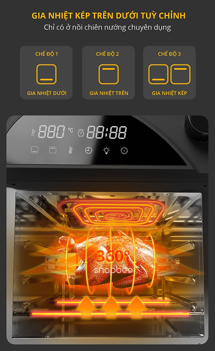 Dễ dàng chủ động trong việc dùng gia nhiệt trên, gia nhiệt dưới hoặc gia nhiệt kép. Giúp đồ ăn chín đều không cần lật dở. Cùng với thiết kế có thể chế biến cùng lúc 3 món ăn với 3 tầng nướng riêng biệt. Đây là một trong những tính năng vượt trội của SNAPBEE QUEEN RF15 so với các nồi chiên không dầu bình thường, nỗi lo thức ăn không chín đều đã được giải quyết. Giúp cho người sử dụng SNAPBEE QUEEN RF15 không cần phải mở nồi để đảo mặt thực phẩm, vừa giúp an toàn tuyệt đối cũng như tiết kiệm thời gian công sức khi nấu nướng.