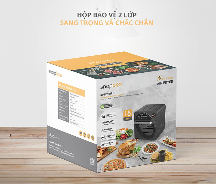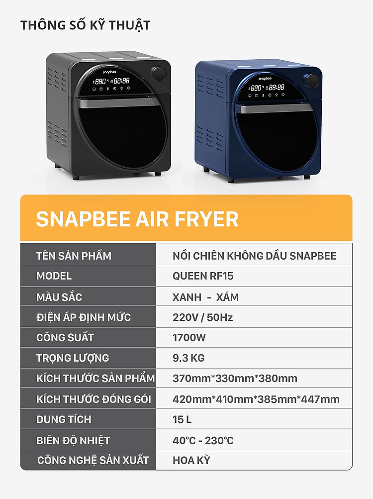 Hãy nhanh tay đặt mua cho mình Nồi chiên không dầu Snapbee-Queen RF15, một siêu phẩm đến từ SNAPBEE ngay hôm nay để tất cả người thân cùng gia đình bạn có thể thưởng thức vạn món ngon chỉ trong tích tắc mà không sợ béo, không sợ nhiều dầu mỡ có hại cho tim mạch và sức khỏe.