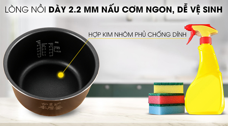 Lòng nồi bằng hợp kim nhôm dày 2.2 mm, có tới 4 lớp phủ chống dính an toàn cho sức khỏe, cho nhiệt lượng tỏa đều truyền đến từng hạt gạo giúp cơm thơm ngon, hấp dẫn.