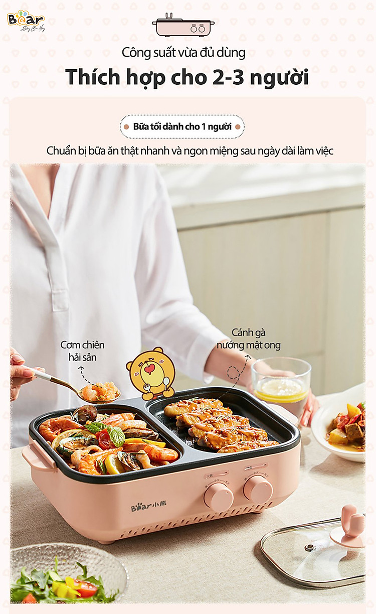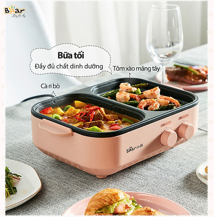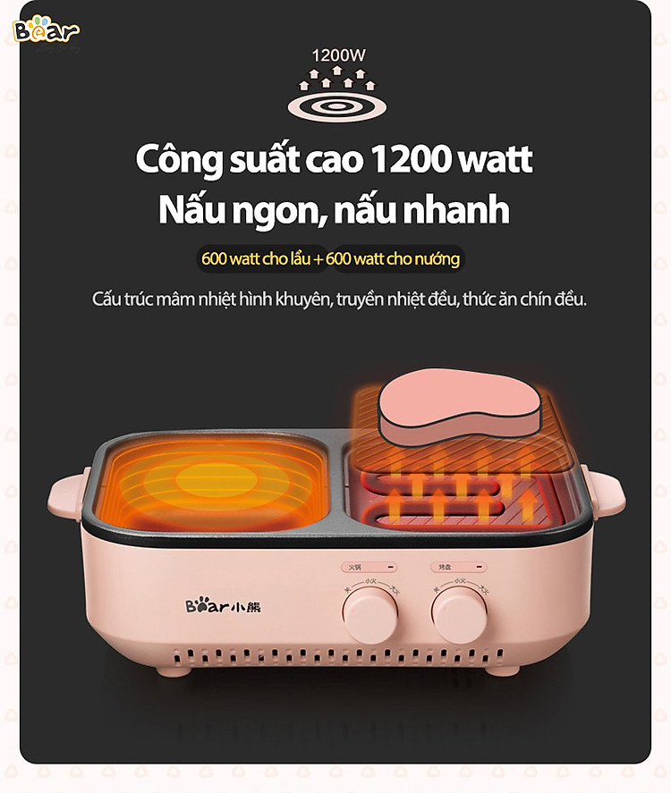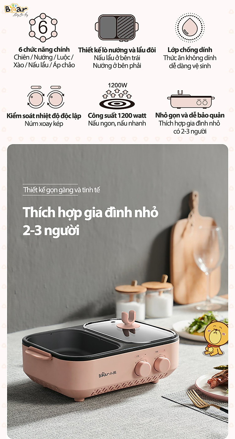 Thưởng thức 2 phong cách ăn cùng lúc với nồi nướng lẩu mini Bear DKL-C12D1 tích hợp 6 chức năng: Chiên, nướng, luộc, xào, nấu lẩu, áp chảo ngay tại gia. Nồi nướng lẩu mini Bear DKL-C12D1 sở hữu thiết kế thông minh với 2 khay Nướng - Lẩu vừa phải thích hợp cho 2-3 người ăn kết hợp cùng công suất 1200W và phù chống dính tiện lợi cho việc vệ sinh sau khi sử dụng. Tham khảo ngay!