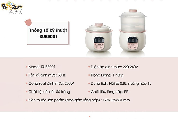 Với nồi nấu chậm Bear DDZ-B08C1 dung tích 0,8 lít đi kèm lồng hấp tiện lợi bạn có thể cùng lúc chế biến món hầm, hấp hoặc nấu cháo cho bé mỗi ngày một cách an toàn và đảm bảo dinh dưỡng. Liên hệ ngay với Bear Việt để mua nồi nấu chậm Bear bảo hành chính hãng trong vòng 18 tháng