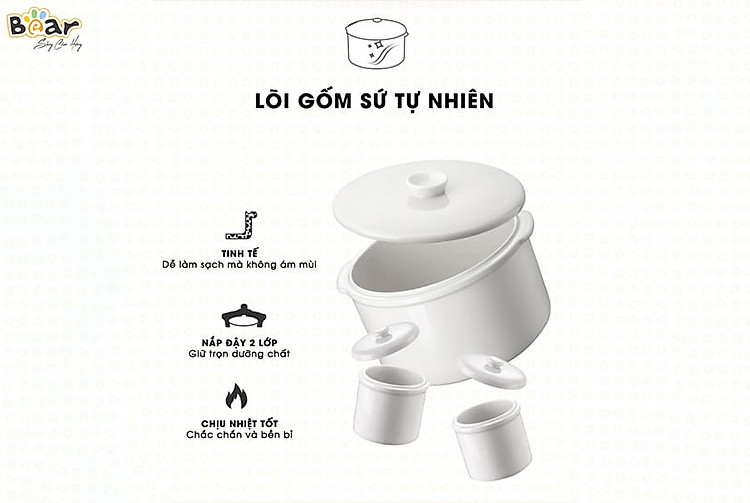 Thố sứ nồi nấu chậm 1.6L Bear được làm từ lõi gốm sứ tự nhiên cao cấp, vô cùng an toàn khi sử dụng để nấu ăn. Ưu điểm của chất liệu này là đảm bảo an toàn và dễ dàng làm sạch mà lại không bị ám mùi. Ngoài ra, các thố sứ đều được trang bị thêm nắp đậy, giúp giữ trọn dưỡng chất và đảm bảo sử dụng lâu dài khi tiếp xúc với nhiệt độ cao.