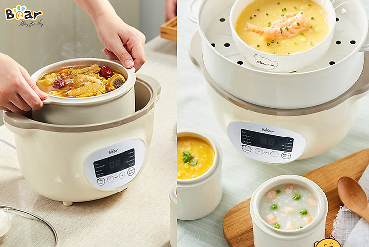 Nồi nấu chậm kèm lồng hấp Bear DDZ-D16J3 (SUBE002) tích hợp nhiều tính năng nấu và hầm tiện lợi, giúp bạn làm nhiều món ăn khác nhau như: hấp, hầm, chưng yến, nấu cháo, Đặc biệt sản phẩm còn được trang bị tính năng hẹn giờ nấu và giữ nhiệt thông minh, không cần dậy sớm mà vẫn có thể nấu cháo thơm ngon vào mỗi sáng cùng nồi nấu chậm Bear DDZ-D16J3.