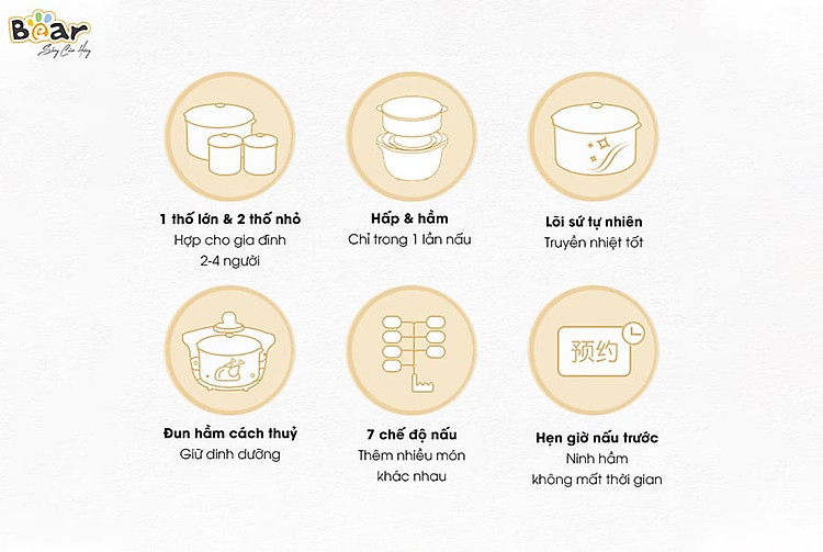 Tính năng của nồi nấu cháo chậm Bear 1.6l đảm bảo chinh phục mọi người dùng với 8 chế độ nấu khác nhau cho phép bạn làm món: hấp, hầm canh, nấu cháo, chưng yến, súp chè, giữ ấm, chỉ với em nồi đa năng Bear này mẹ sẽ dễ dàng chế biến nhiều món ăn độc lạ làm đa dạng thực đơn cho cả gia đình.