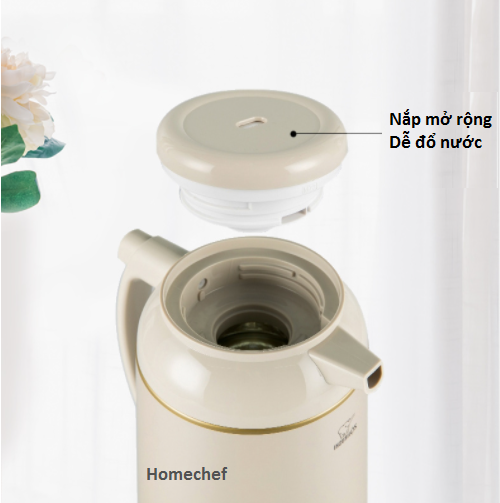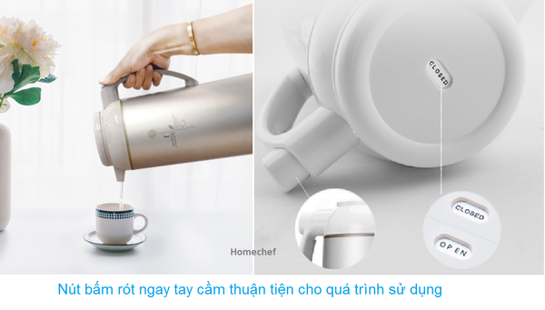 Bình có một nút bấm ngay tay cầm thuận tiện cho quá trình sử dụng. Nút bấm đóng mở thuận tiện cho việc rót nước nóng, tránh việc mở nắp khiến nhiệt độ nước bị giảm đi và an toàn hơn khi có trẻ nhỏ.