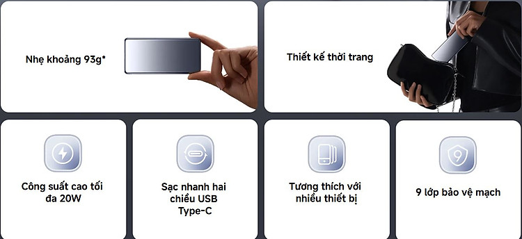 Điểm nổi bật nhất của Xiaomi Ultra Slim Power Bank 5000mAh chính là thiết kế siêu mỏng và nhẹ. Với độ dày chỉ khoảng 10mm và trọng lượng chỉ 93g, sản phẩm này nhẹ nhàng nằm gọn trong túi quần, túi áo hay túi xách mà không gây cảm giác vướng víu hay nặng nề. Kích thước nhỏ gọn tương đương một chiếc thẻ tín dụng giúp bạn dễ dàng mang theo bên mình mọi lúc mọi nơi.