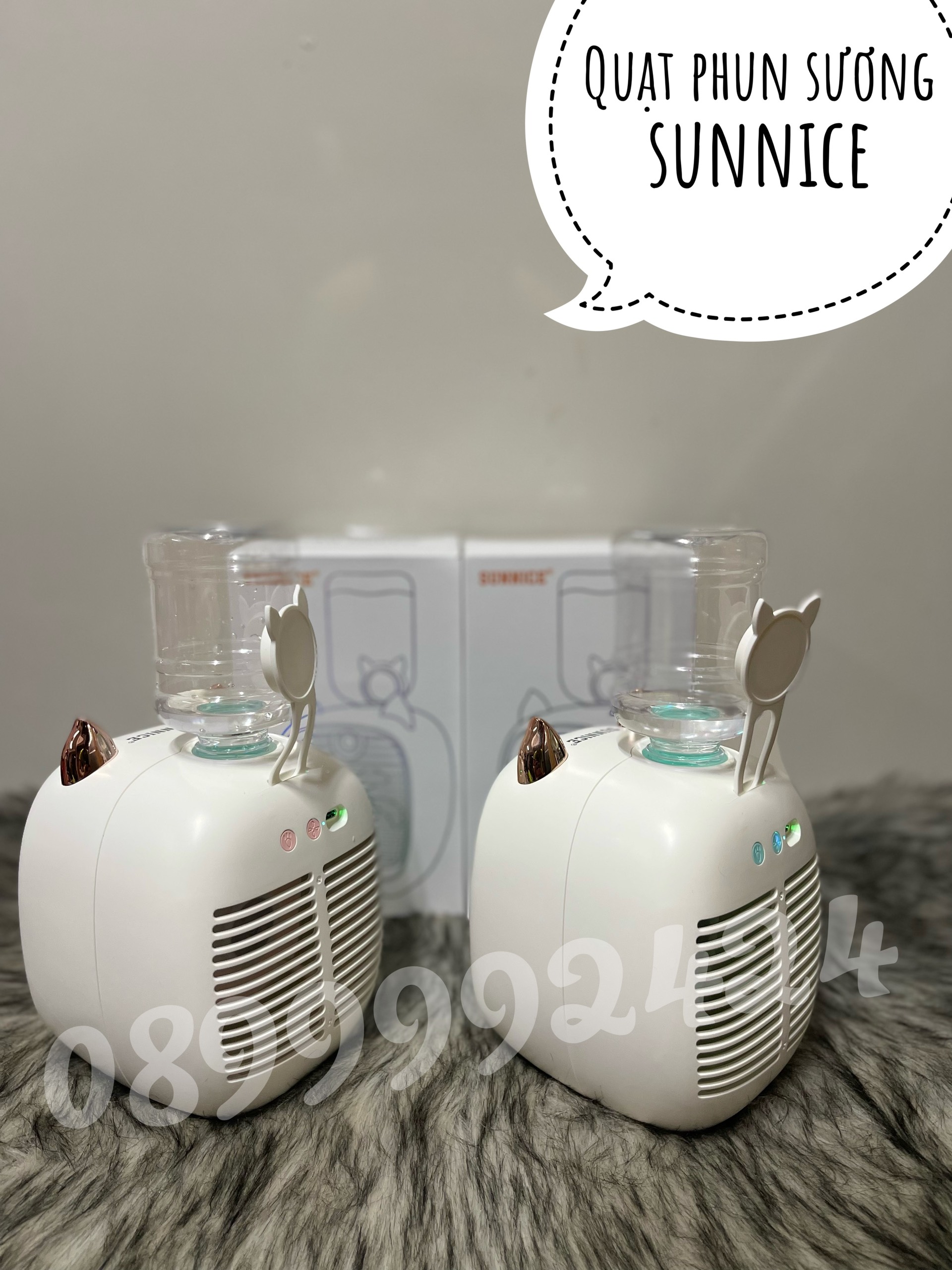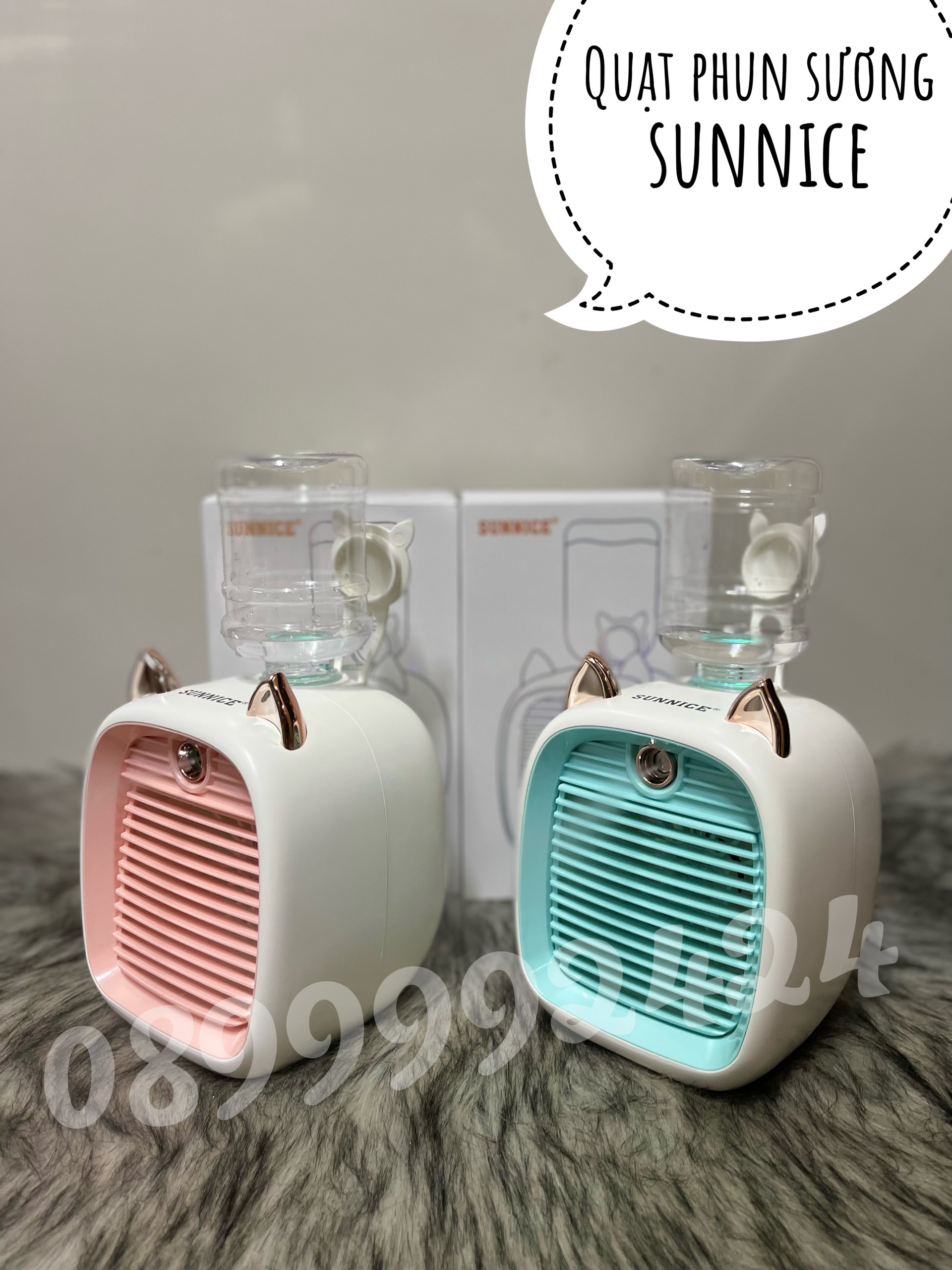 Quạt sạc phun sương Sunnice với thiết kế và 2 màu sắc dễ thương, có thể điều chỉnh lồng quạt lên xuống theo ý thích.