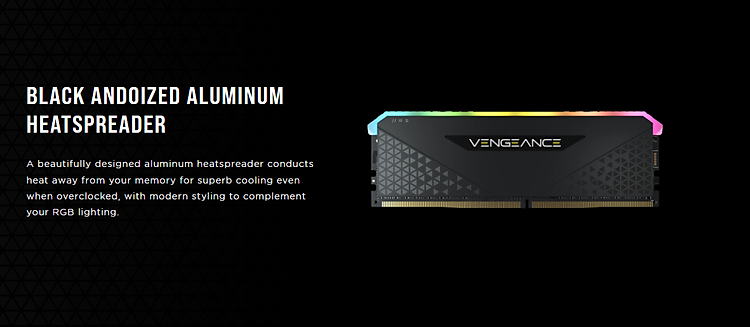 Một bộ tản nhiệt bằng nhôm được thiết kế đẹp mắt dẫn nhiệt ra khỏi bộ nhớ của bạn để làm mát tuyệt vời ngay cả khi được ép xung, với kiểu dáng hiện đại để bổ sung cho ánh sáng RGB của bạn.