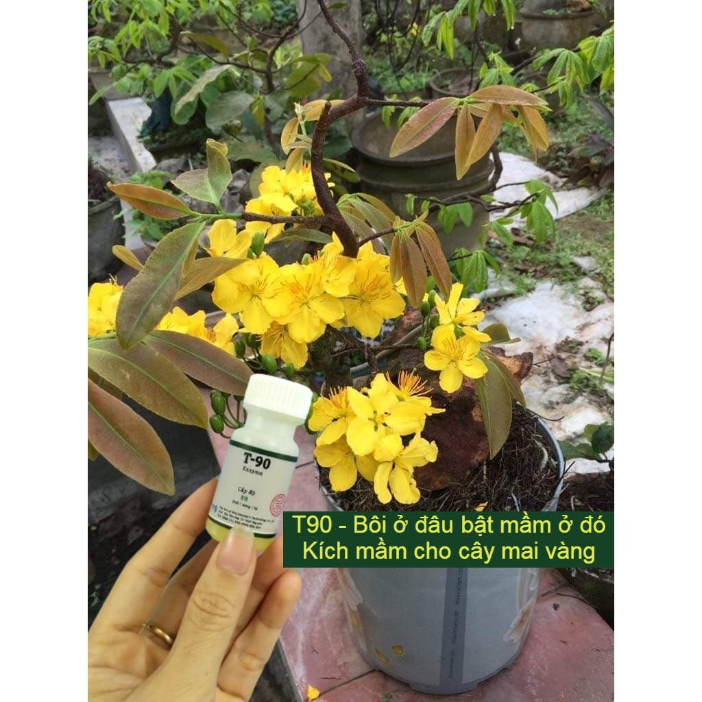 - Với cây Mai và cây bonsai : Trước khi bôi mình cạo nhẹ lớp vỏ già sau đó dùng tăm bông chấm trực tiếp dung dịch T90( KO cần pha nước) bôi vào những vị trí mình muốn kích mầm hoặc bôi lên mắt ngủ thì cây sẽ bật mầm nhanh hơn. Tuỳ từng cây mà thời gian mọc mầm từ 20-50 ngày.