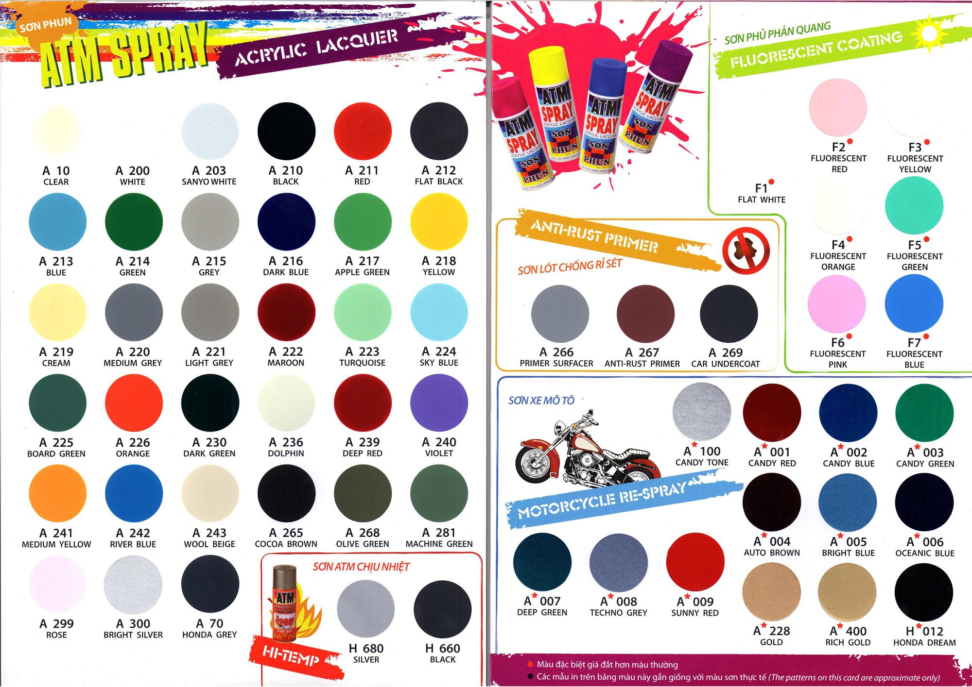 Sơn xịt ATM là hỗn hợp nhựa NC và Acrylic Lacquer phối hợp cùng chất tạo màu đặc biệt , được đóng gói dưới dạng bình xịt cầm tay rất tiện dụng , dùng để sơn trang trí và bảo vệ cho các bề mặt bằng gỗ , nhựa , kim loại , bê tông...