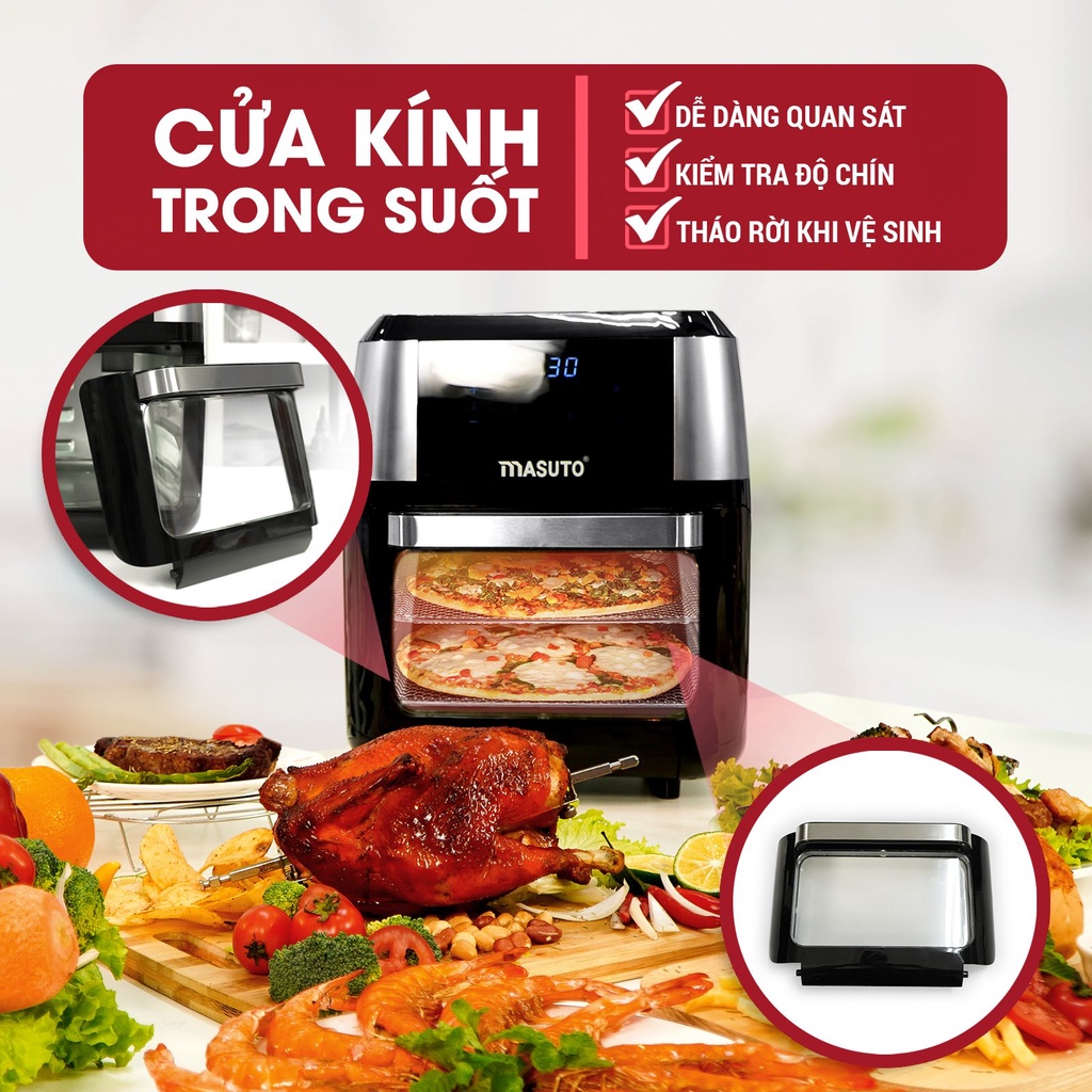 Giới thiệu Nồi bếp chiên không dầu kiêm lò nướng chính hãng Masuto 12L quay gà nguyên con chiên khoai siêu giòn