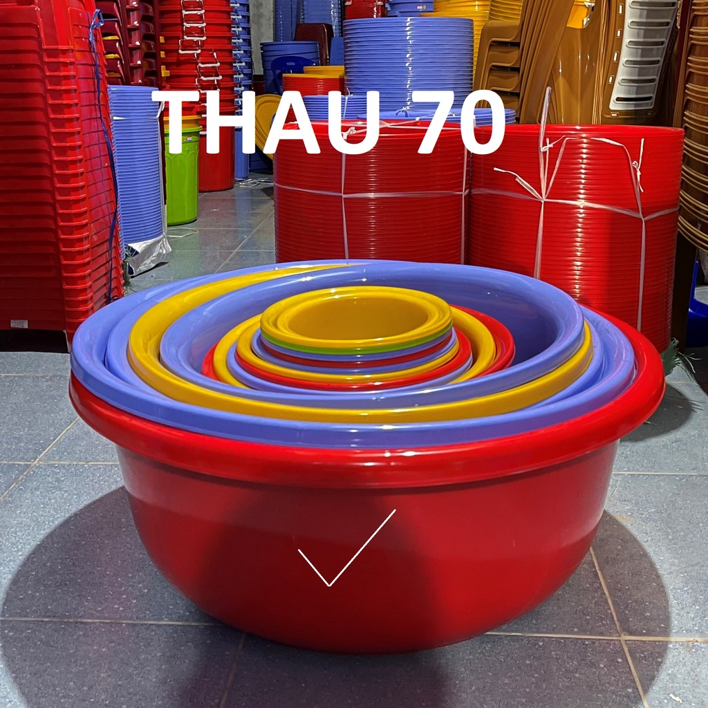 Giới thiệu Thau nhựa tròn size 70 làm từ nhựa pp chính phẩm loại 1 dày dặn màu đỏ, xanh, vàng bóng đẹp an toàn với người sử dụng