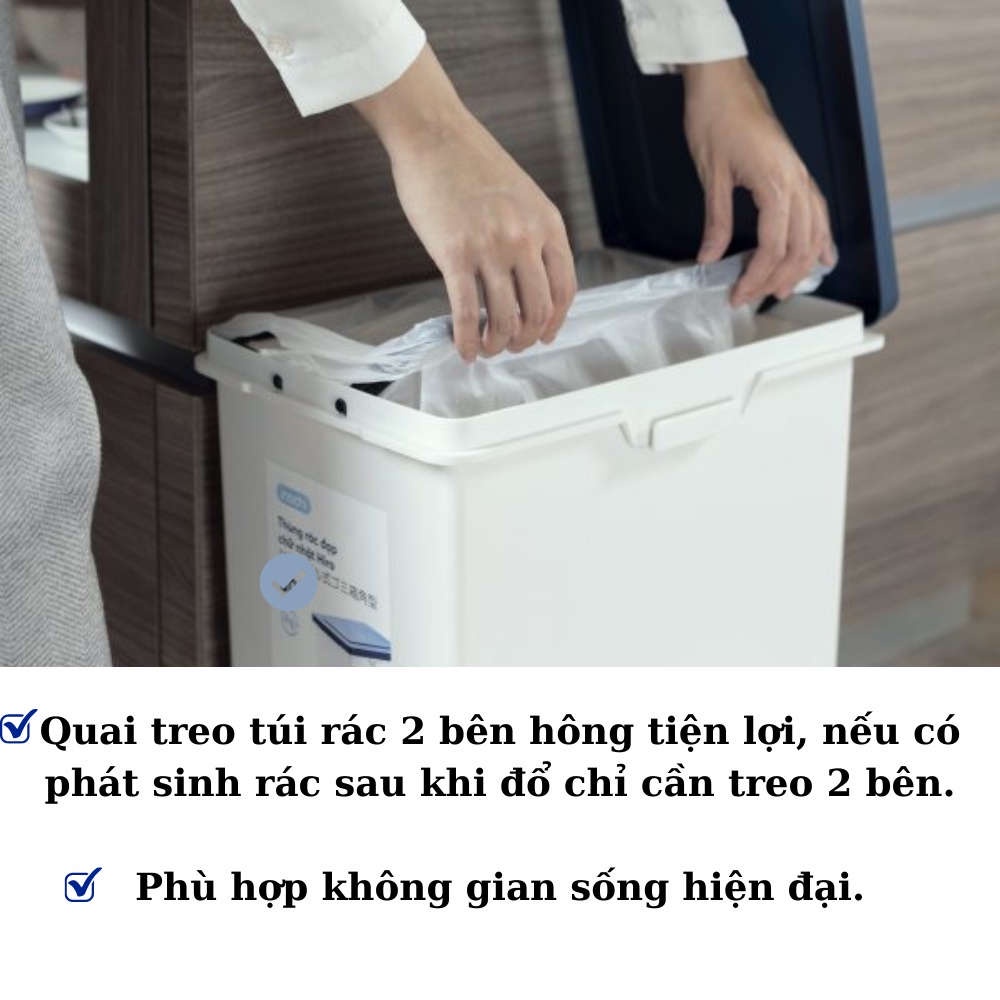 - Quai treo túi rác 2 bên hông tiện lợi, nếu có phát sinh rác sau khi đổ chỉ cần treo 2 bên.