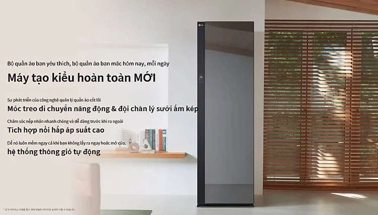 LG Styler SC5GMR80H sở hữu thiết kế vô cùng sang trọng với mặt gương kính đen, tủ thường được lắp đặt ngay bên trong phòng treo quần áo (đối với gia đình có phòng thay đồ và phòng treo quần áo riêng) tạo không gian đẳng cấp cho người dùng.