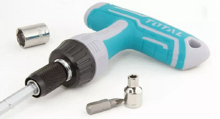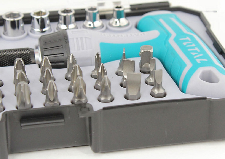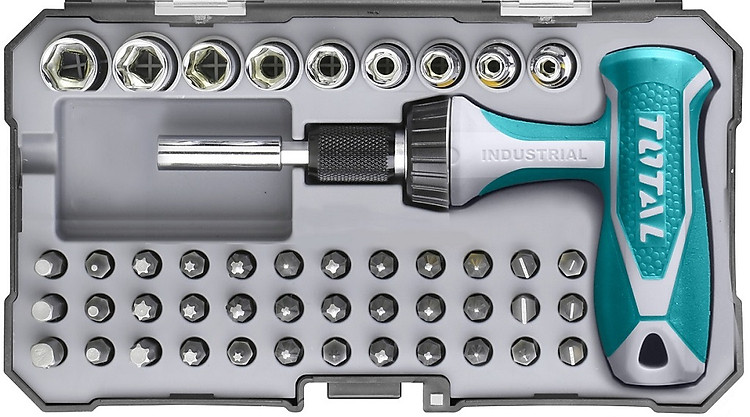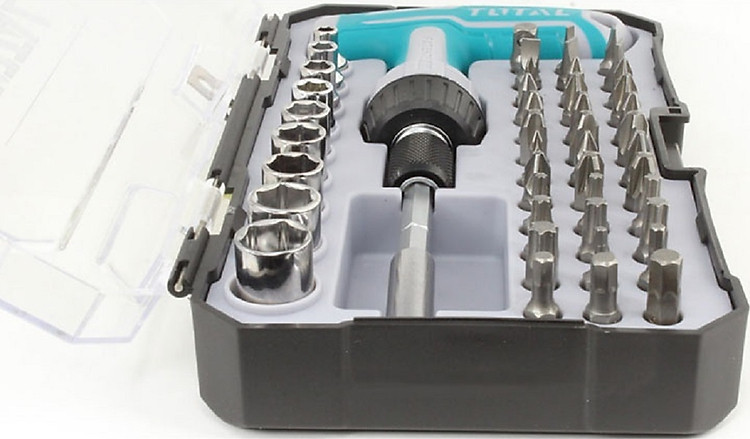 Bộ tua vít vặn tay cầm chữ T 47 chi tiết đa năng TOTAL TACSD30476 có 35 mũi tua vít, 9 ổ cắm, 1 bộ chuyển đổi, 1 bộ giữ tua vít, 1 tay cầm và 1 hộp nhựa bảo quản