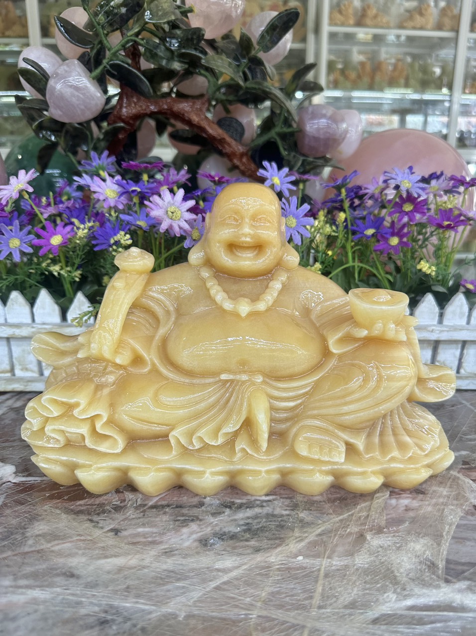 Tượng Phật Di Lặc ngồi tựa bao tiền cầm thỏi vàng phong thủy đá ngọc hoàng long