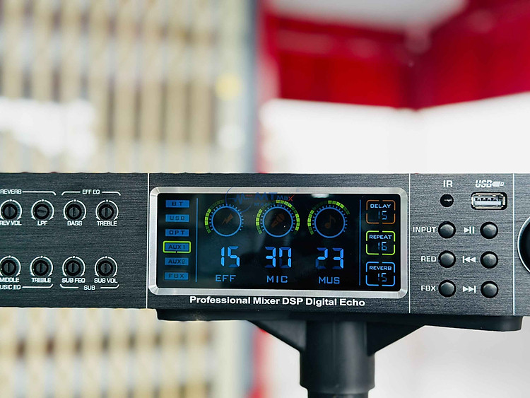 không chỉ dừng lại ở vẻ đẹp ngoại hình, mà còn sở hữu công nghệ âm thanh tiên tiến với hàng loạt tính năng điều chỉnh âm thanh cao cấp. Bạn có thể tùy chỉnh âm thanh với EFF EQ, MUCSIC EQ, MIC EQ, SUB, DELAY L VÀ R riêng biệt, REPEAT TIME và REPEAT VOLUME, LPF, ECHO, FBX, REVERB, BASS, MID, TREBLE, EXCITER. Hiệu ứng âm thanh mượt mà và cuốn hút từ delay và reverb làm cho mỗi bản nhạc trở nên sống động hơn bao giờ hết.