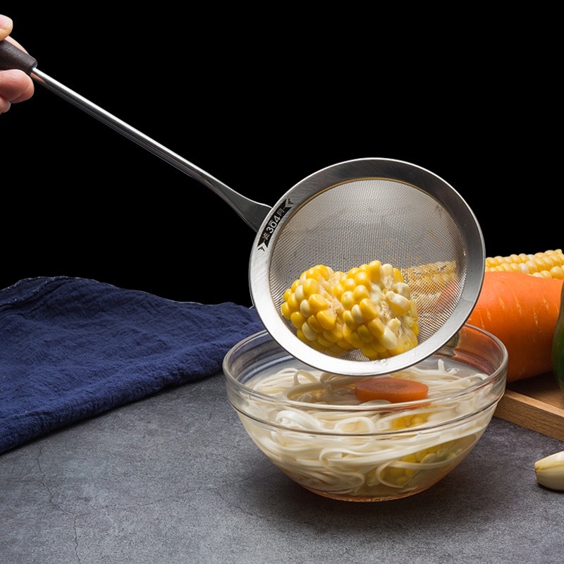 Vợt hớt bọt, vợt lọc dầu, vợt vớt cặn bã inox mờ 304 Xuất Khẩu Nhật cán Gỗ Khắc Cổ Điển