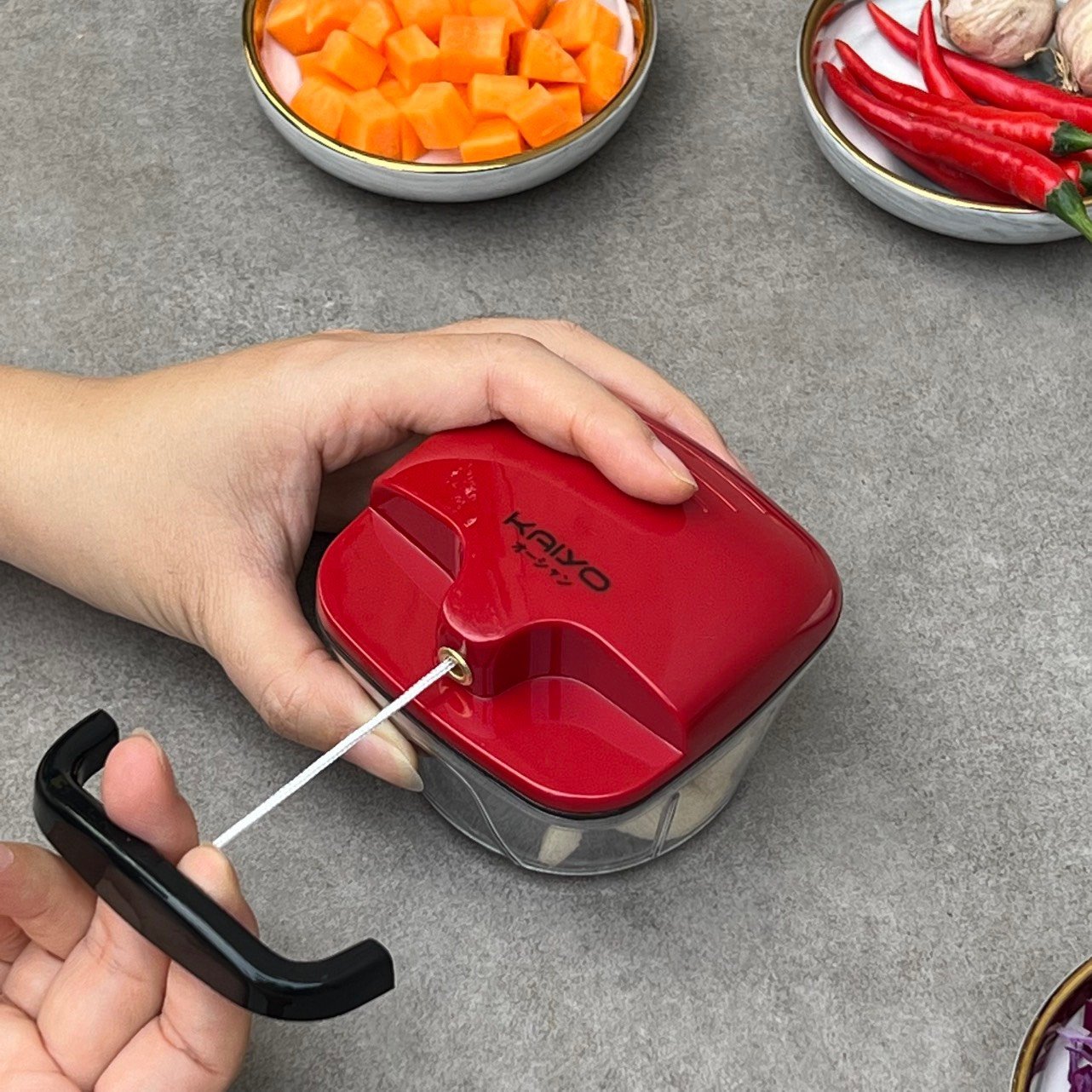 Xay tỏi Kaiyo Nhật quá xin sò, chất liệu nhựa là dòng nhựa thủy tinh PS, có độ trong suốt và chịu nhiệt cao hơn dòng ABS mà các hãng khác đang dùng. Lưỡi dao inox 420 to bản, siêu sắc